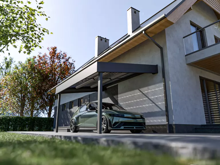 Sorgen Sie für eine perfekte Anpassung an Ihr Gebäude. Der Pultdachcarport STUK wird exakt nach Maß gefertigt. Die deutliche Dachneigung bietet nicht nur praktische Vorteile bei der Entwässerung, sondern kann auch die Durchfahrtshöhe an der Wandseite optimieren, was bei höheren Fahrzeugen von Vorteil ist. Nutzen Sie unseren Konfigurator, um die präzisen Abmessungen (Breite, Tiefe, ggf. Neigung) und Farben festzulegen, sodass sich der Carport harmonisch einfügt.
